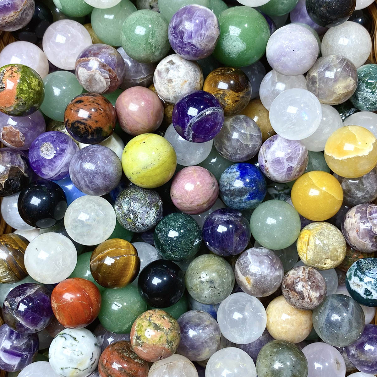 Crystals mini sphere confetti include(Crystal Subject Keep Updating) :amethyst ,moss agate ,clear quartz ,rose quartz ,orange calcite , labradorite ,green aventurine ,mahogany obsidian ,petrified wood ,red jasper ,green jade ,unakite ...