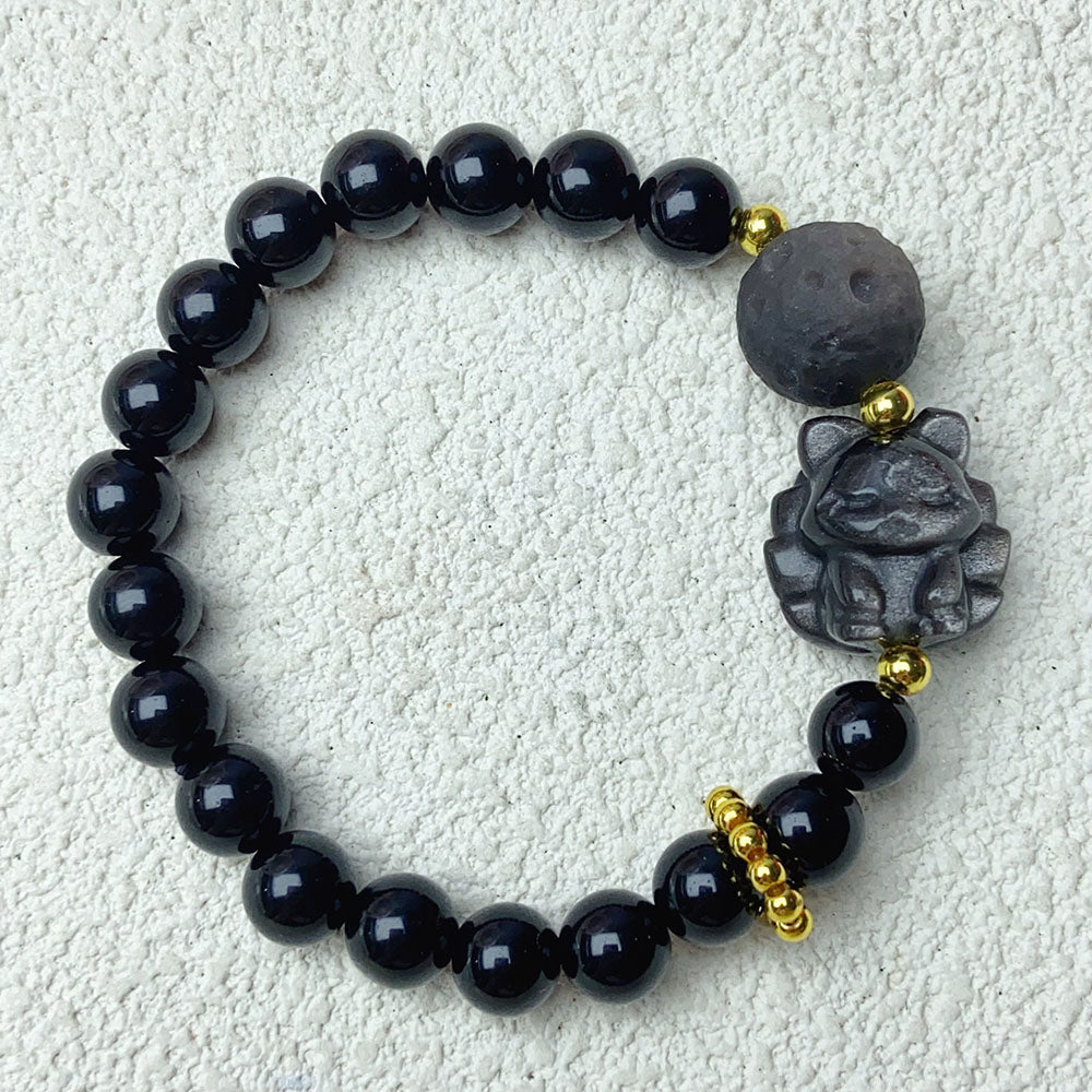8mm Black Obsidain Beads With Silver Obsidian Nine Tailed Fox Carving Bracelet Charm Bracelet Wristband Gift