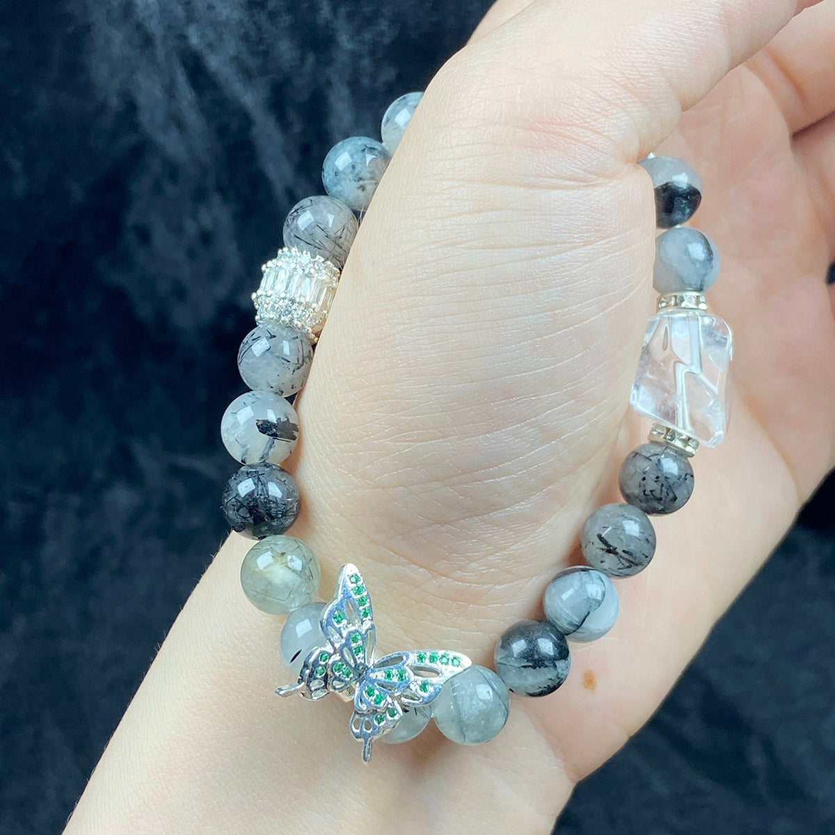 8MM Black Tourmaline Beaded Bracelet With Butterfly Accessory Women Jewellry