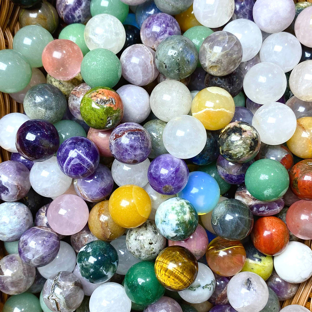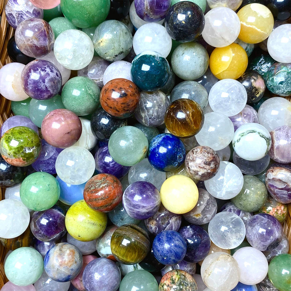 Crystals mini sphere confetti include(Crystal Subject Keep Updating) :amethyst ,moss agate ,clear quartz ,rose quartz ,orange calcite , labradorite ,green aventurine ,mahogany obsidian ,petrified wood ,red jasper ,green jade ,unakite ...