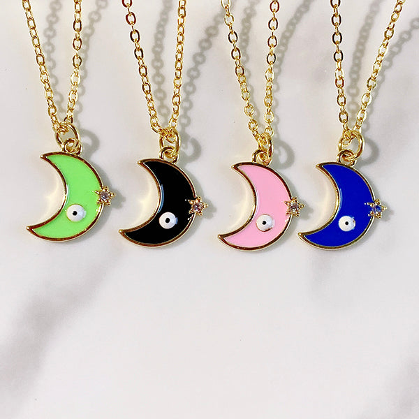 Stainless Steel Evil Eyes Moon Enamel Pendant Necklace Zircon NC0033