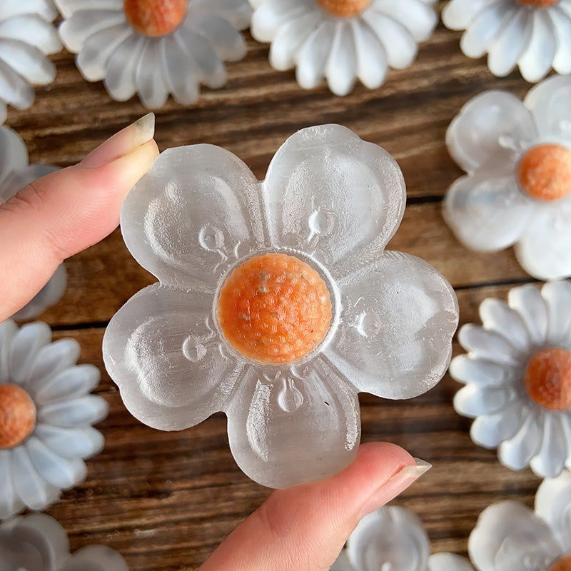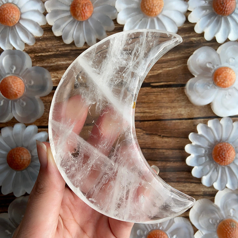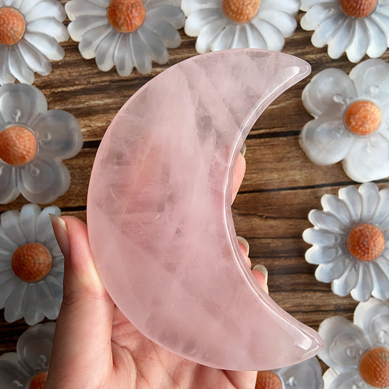 Clear Quartz Moon & Rose Quartz Moon & Selenite Flower Carving