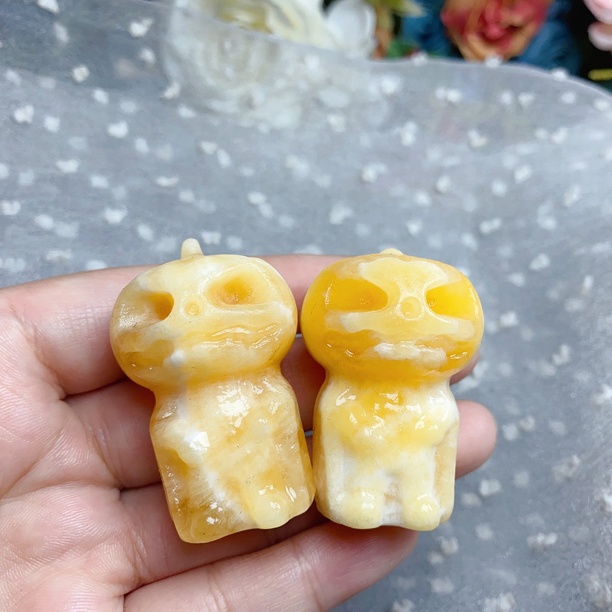 Rose Quartz & Fluorite & Orange Calcite Crystal Carved Pumpkin Skulls For Halloween