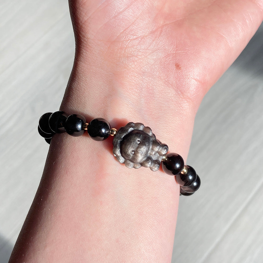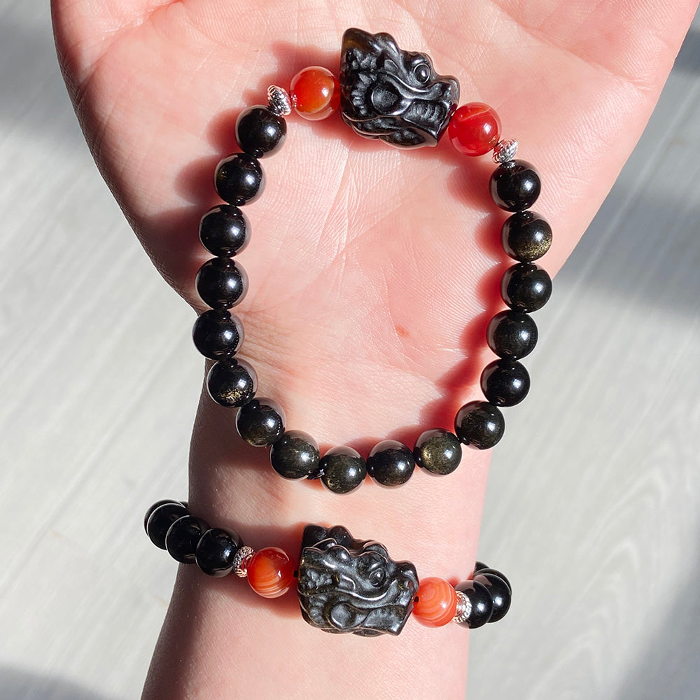 Obsidian Dragon Head &Lion & Moon Carving Beads Crystal Bracelet